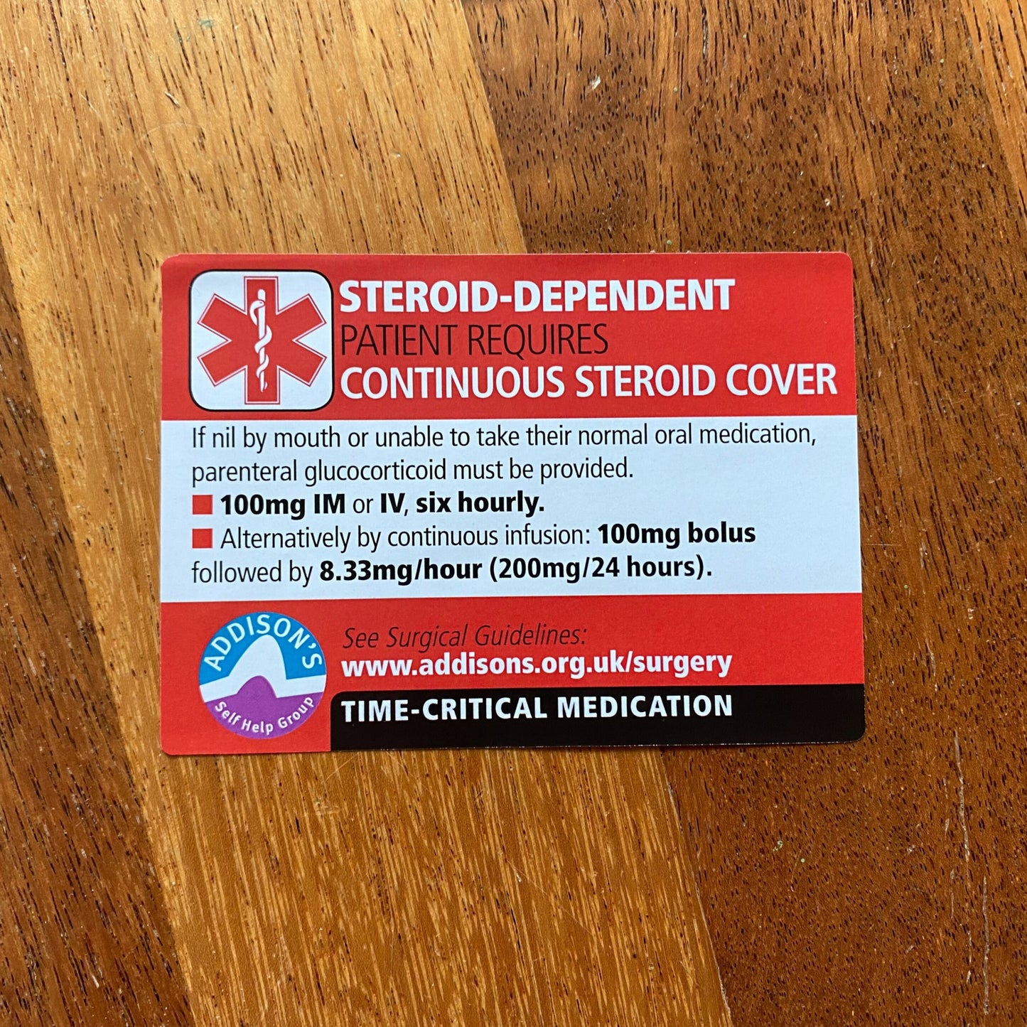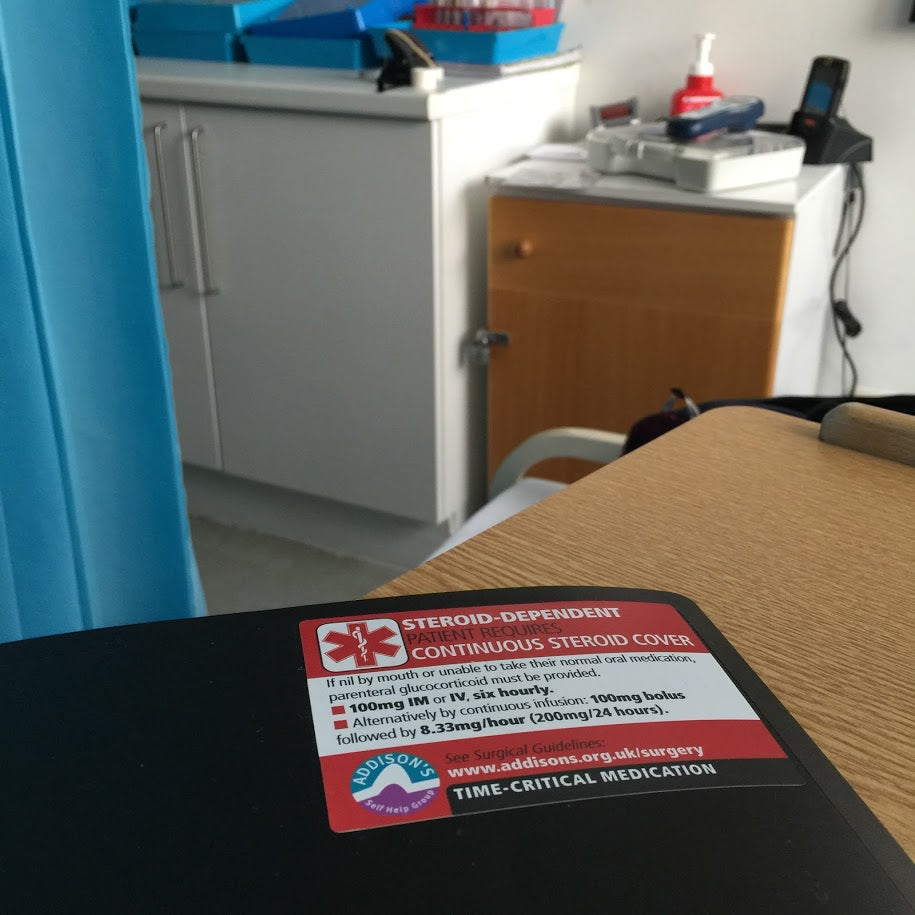 The ADSHG drugs chart steroid alert stickers are intended for people with Addison's to take with them for day case and inpatient surgical procedures to alert nursing and medical staff to their steroid-dependence and their time-critical need for steroid medication when unwell.